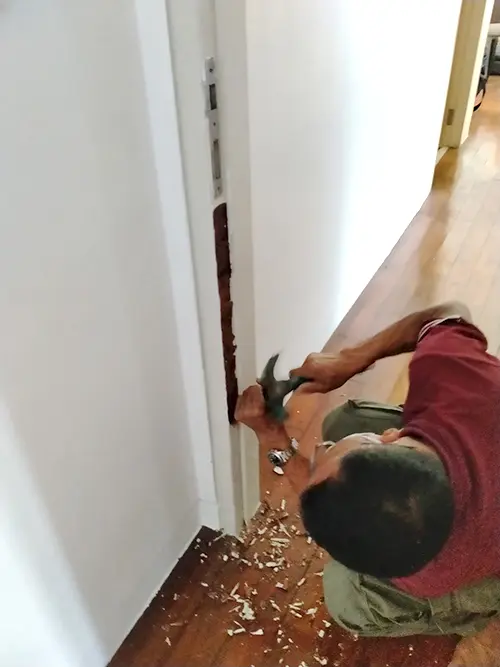 ドアも、以前、他の業者に修理してもらったら、壊れた取っ手周りの仕上がりが雑です。しかもドア全体を塗装したのが今までのほかのドアとは違い、てかてか光る塗装になってしまいました。 当初、塗装のし直しをと思っていましたが、便利屋さんが「これは交換した方がいい」とすすめられ、出来上がったのが本来の色とほとんど同じで、とても丁寧に仕上げてありました。