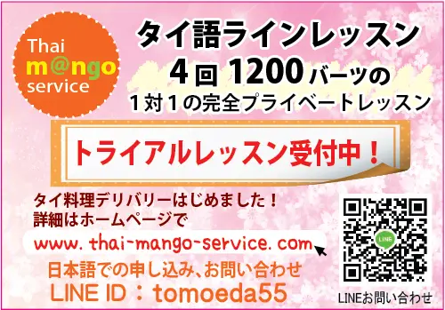 ベテラン日本人講師が対応する「マンゴーサービス」ではLINEを使って、タイ語のマンツーマンレッスンを行っています。LINEを使ったタイ語のオンラインレッスンは他では行っていないようですが、マンゴーサービスでは、もともと生徒さんの自宅や会社を訪れてプライベートレッスンを行っていました。