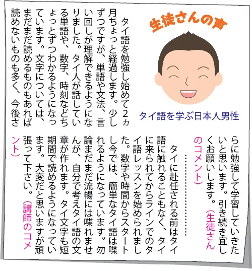むしろ駐在員の生徒さんが多かったため急な用事や、会議が長引くなどの理由での当日のキャンセルにもLINEだと対応ができます。スマートフォンを使って会社と、自宅までの車の送迎中に受講される生徒さんもいます。教材のタイ語単語集や音声ファイルもLINEで送っています。貴方もLINEレッスンでタイ語のプライベートレッスンを受けてみませんか?