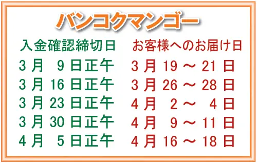 毎年多くの注文がある「バンコクマンゴー」では、日本へのマンゴー宅配を受付中です。購入申し込みはウェブサイトかFAXで随時受付中です。タイで注文して、日本の指定の住所へお届けいたします。お届け日と申し込み締め切りは、下の表をご覧下さい。