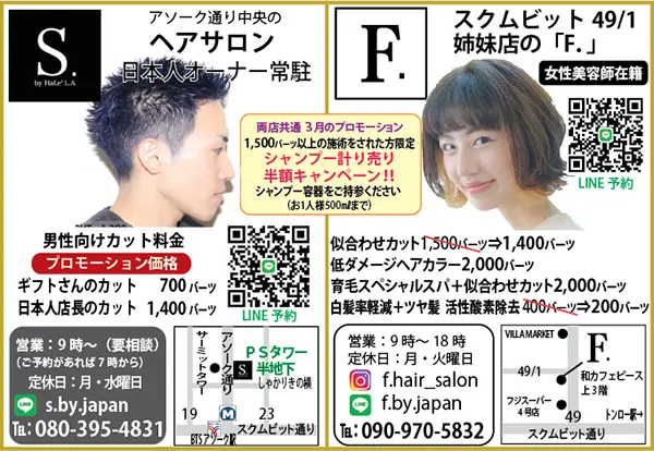 ヘアサロンSとF 3月のプロモーションは両店同時開催 シャンプーソムリエが厳選したシャンプー 1,500バーツ以上の施術で半額で購入できる!