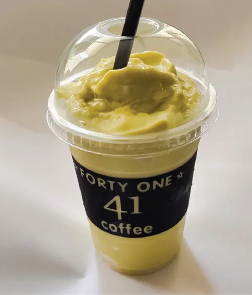 同店はコーヒーのほか、くだものスムージーも豊富で、マンゴージュース、ココナッツジュースなど。そして、好評なのはアボカドのジュース。濃厚で病みつき間違いなし。他にソーダジュースなどもある。下の広告参照で。