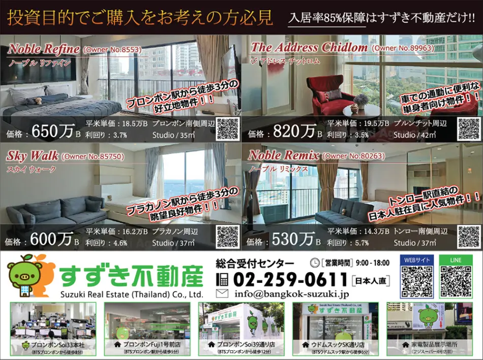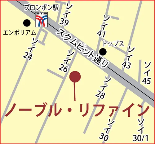 日本人居住区中心で比較的新しく、リーズナブルな対象先として、紹介されることが多いこちらの物件。ソイ26の入り口近くで、プロンポン駅まで徒歩5分。ソイ26は南に向かえばラマ4世通りに出られ、その先のサトーンエリアへも向かいやすく、またモーターウェイの乗り場もアクセスがしやすいことで有名です。駅周りでもあり飲食店やマッサージ店も多いのは、ホテルも隣接しているのが理由の一つです。