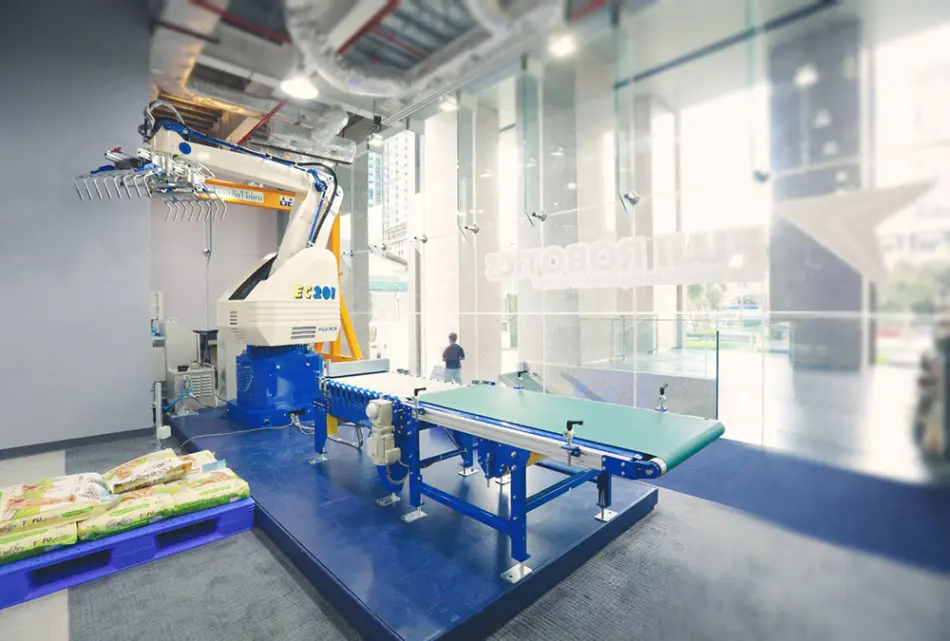 不二輸送機(タイランド)では、パレタイズを最も効率的に行うことができるEC201も取り扱っています。このモデルは、すべてのフジエース製品の中で最も有名なパレタイジングロボットです。商品を袋や飲料用カートンに梱包する作業に向いていて、最も効率的で最高レベルの技術を備えています。