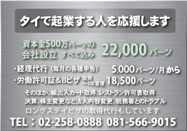 現在、資本金500万バーツで登記した会社などが調査対象になることが多いので、できるだけ資本金200万バーツ、400万バーツで会社登記するのがよいと思われます。問い合わせは下記のJJPアカウント社まで。