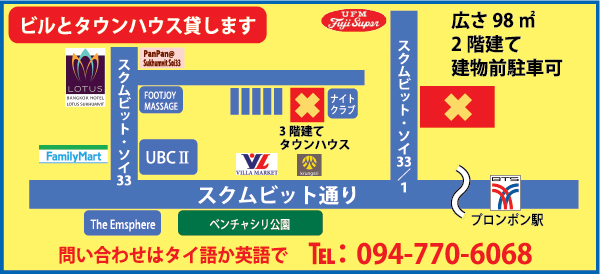 バンコク在住日本人が多く集まるスクムビット・ソイ33/1の商業スペース向きの土地・建物を貸します。BTSプロンポン駅から徒歩5分の好立地で、日本の食品やさまざまな商品を買い求める人で1日中賑わっているので、昼夜問わず営業できます。小さなホテルや小さな和風の商店、カフェ、パブやバーにも適しています。地下鉄スクムビット駅からも1駅なので、BTS沿線以外の集客も期待できます。