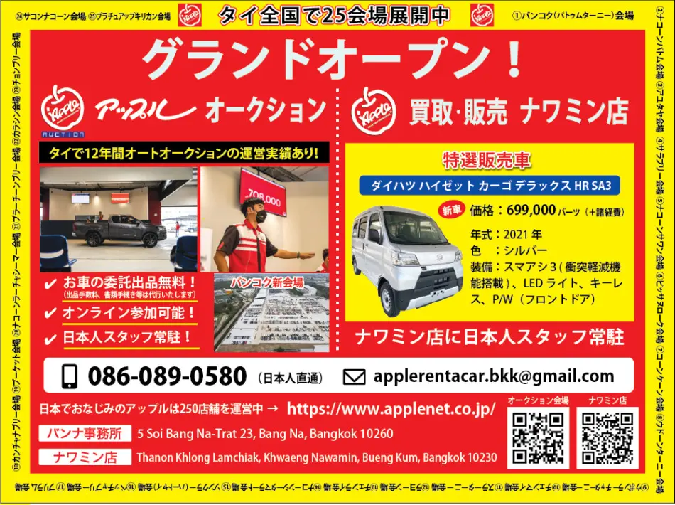 タイで新車や中古車の売買でおなじみの「アップル」では、オートオークションの会場をバンナーからパトゥムタニーに移してグランドオープンしています。アップルのオートオークションは、12年の実績があり、タイ国内で多くの車やオートバイの売買を手がけています。