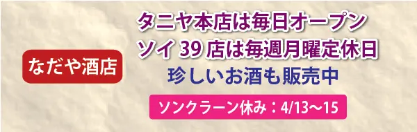 なだや酒店タニヤ本店は毎日オープン ソイ39店は毎週月曜定休日 珍しいお酒も販売中 ソンクラーンは4/13~15休み