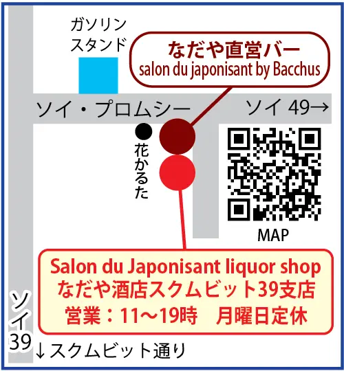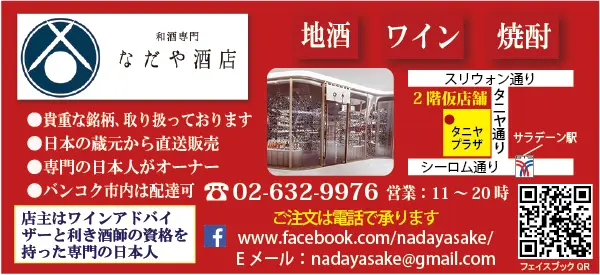 おいしい日本酒や焼酎、果実酒などを豊富に取り揃えている「なだや酒店」はバンコクで2店舗が営業しています。