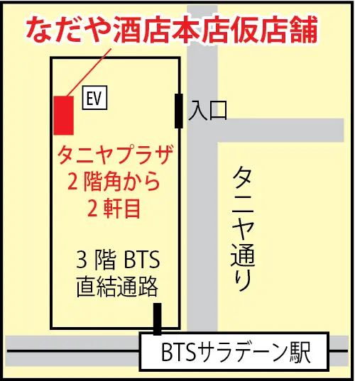 本店はBTSサラデン駅から直通で行けるタニヤプラザにあり、現在は2階仮店舗で営業しています。タニヤプラザの2階はゴルフ用品店が並んでいますが、なだや酒店はショールームのような外観でお酒のボトルが並んでいるのでわかりやすいです。エレベーターから近い、角から2軒目の場所でオープンしています。