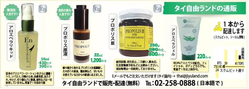 タイ自由ランドで販売している「プロポリス原液(1本1,200バーツ)」は免疫力を高めることで知られていますが、私は10年前にタイで働き始めてから飲み続けており、これまで風邪で寝込んだことありません。