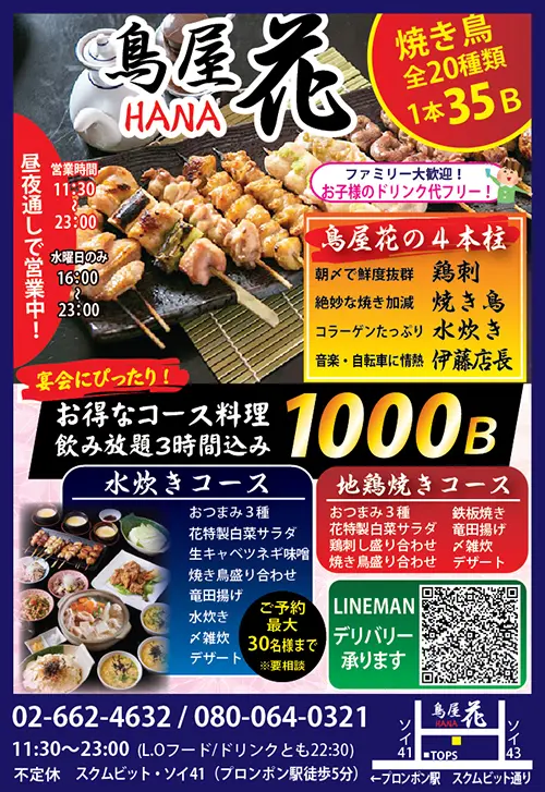 夕方からは、小宴会にぴったりなので、感染対策万全の同店をぜひ、利用ください。水炊きコースと地鶏焼きコースがあり、どちらも竜田揚げや焼き鳥盛り合わせ、白菜サラダ、締めの雑炊、デザートが付き、その上に、3時間飲み放題なので超お得。予約は最大30人までOK。夕方からはソイ41沿いに駐車可。ぜひ、夜は炭火焼きの焼き鳥をはじめ、コラーゲンたっぷりの出汁が効いた水炊きも試してみてほしい。下の広告も参照で。
