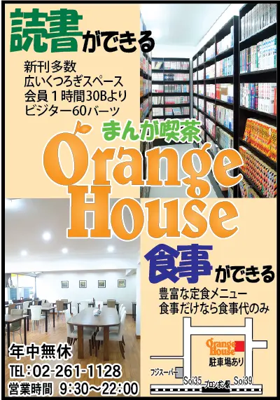 宅配デリバリーやオレンジクッキングボックスをデリバリーしている「オレンジハウス」では、ソイ39の中ほどにある漫画喫茶でゆっくり本が読めます。新着ではONE PIECE 101、102巻、SPY × FAMILY 5、6、7、8巻、東京卍リベンジャーズ 19、20、21、22、23、24、25巻、キングダム 64巻、呪術廻戦18巻、Dr.STONE 24、25巻、怪獣8号 5、6巻、ワールドトリガー24巻、BORUTO13、14、15、16巻、ゴールデンカムイ 28巻、不能犯 11、12巻など、このほかにもたくさん。来店して確認ください。下の広告参照で。