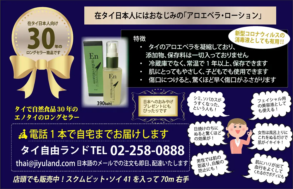 タイ自由ランドで販売している「アロエベラリキッド」は、男女問わず、うるおいのあるしっとりした肌になると人気商品です。