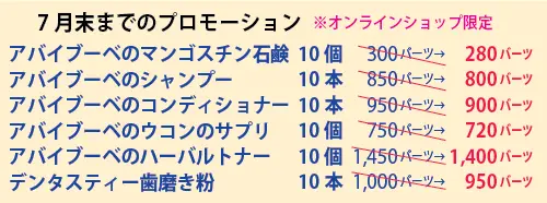日本へのお土産としても人気のアバイブーベの石けん、シャンプー、コンディショナー、ウコンのサプリ、ハーバルトナー(化粧水)、さらにデンタスティーの歯磨き粉がそれぞれ10個まとめて買うとお得な価格でお届けします。ブレズオンラインショップへの注文となるので、QRコードをスキャンして下さい。
