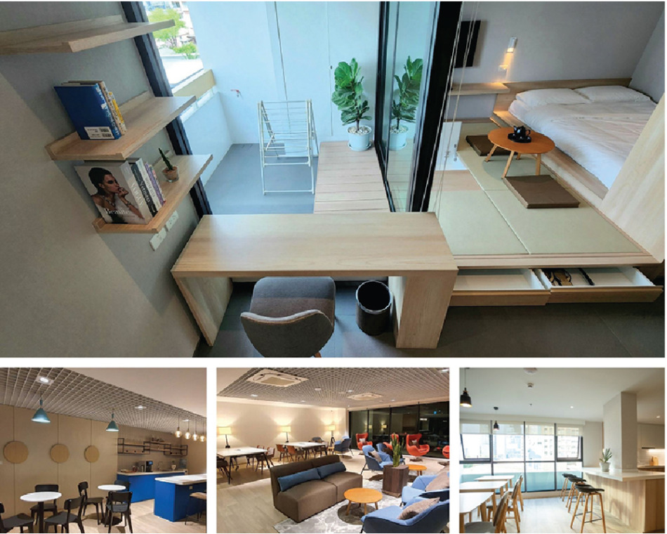 建物は1階がロビーで2階と3階がサービスオフィスとコワーキングスペースになっています。4階から6階がサービスサパートのエリアで、全部屋スタジオタイプで洗濯機も完備しています。リビングは畳敷きです。