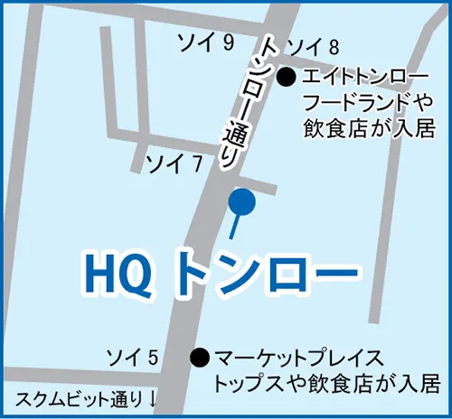 今回紹介するHQトンローは、トンローの中心トンロー・ソイ6にあり、飲食店やスーパーが近いという暮らしやすい立地にあります。