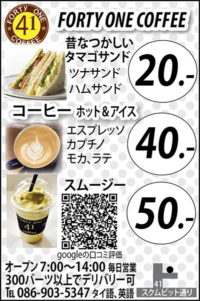 スクムビット・ソイ41のセブンイレブン前で開いているフォーティワン・コーヒー。店頭売りが主体のよくあるテイクアウトのコーヒー&ジュース屋さんだが、グーグルの評価がすばらしく、口コミが100件以上で、星5つを維持していて、実際にコーヒーを飲んでみたが、確かに申し分ない。最高か?というと、そうでもないが、この手の店のテイクアウトならOKだろう。