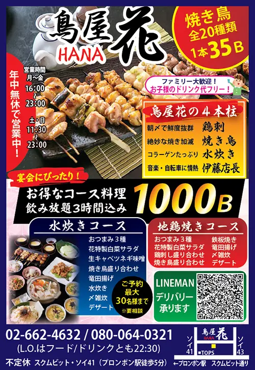 一方、夜は1本35バーツの焼き鳥とお得な宴会セットがおすすめ。水炊きコースと地鶏焼きコースがあり、水炊きは10時間以上煮込んだ濃厚な味が絶品。女性にはうれしいコラーゲンもたっぷり。地鶏焼きコースは、鮮度抜群の鶏刺や焼き鳥、竜田揚げなど。