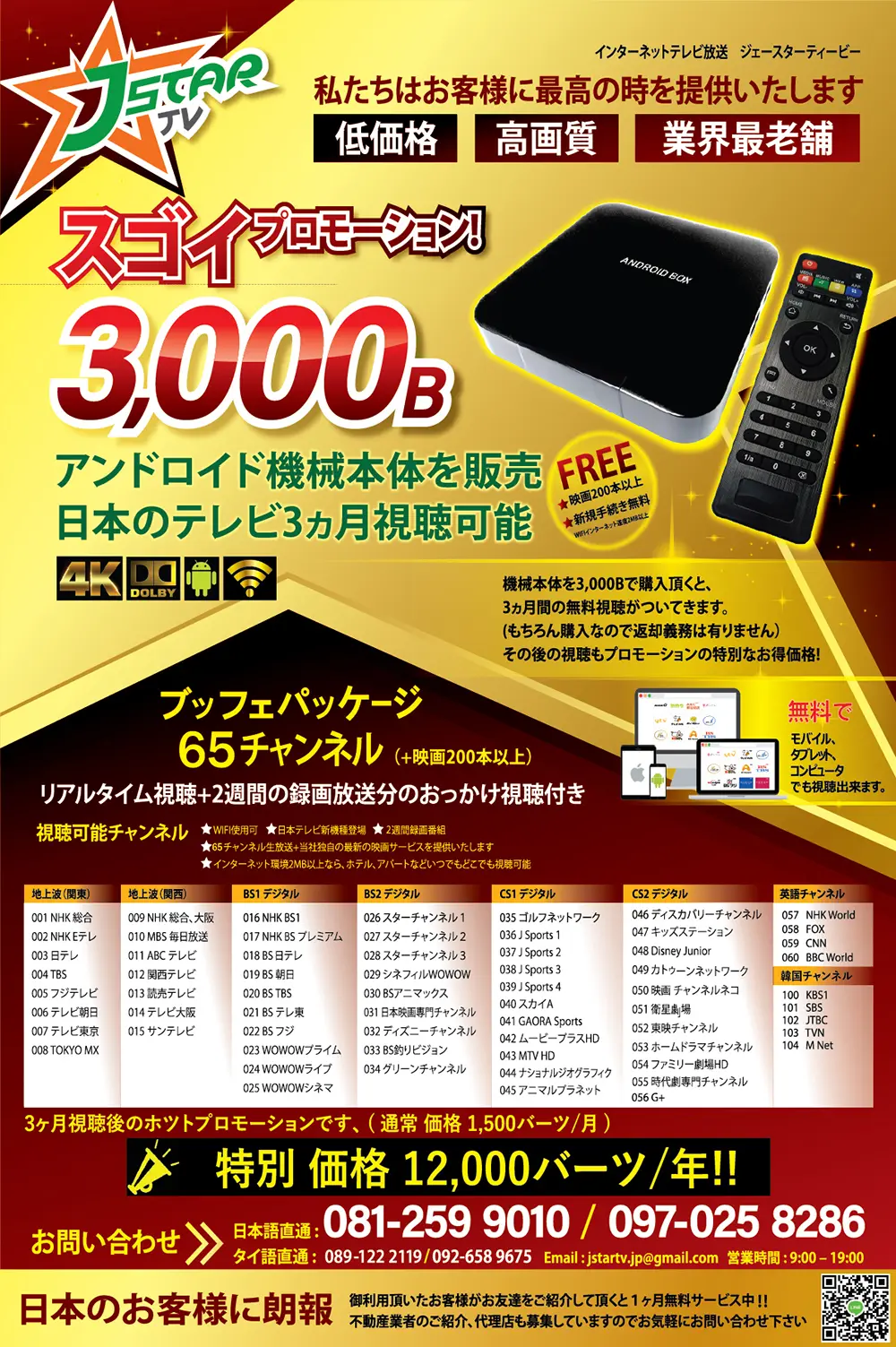 まず、3ヵ月の視聴を機材の買い取りで3,000バーツ、のち1年契約で12,000バーツ。1ヵ月あたり1,000バーツ、機材買い取りなので本帰国する際に退会手続きや返却の必要もありません。