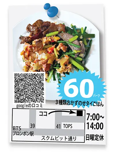 タイでも円安が加速してさらにインフレで、タイの値段もどんどん上がっているが、ぶっかけ飯のごはんも今では60バーツのところもある。そんななかで、40バーツから食べられて、種類も豊富なのが、スクムビット・ソイ41を入ってセブンイレブンの斜め向かいにあるタイのおかず屋さん。店頭にすでにおかずがずらりと並んでいて、屋台飯ではなく、ちゃんと店内で食べられるのがよい。もちろん、テイクアウトもできる。