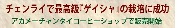 そんなメーチャンタイ村で、世界最高級のコーヒー品種「ゲイシャ」の栽培に成功し、バンコクのアカメーチャン・タイコーヒーショップで販売を開始いたしました。プロモーションとして、1杯200バーツで販売いたします。
