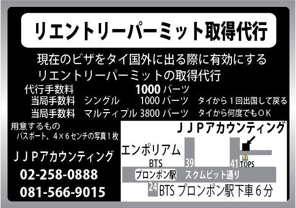 必ず、現在のビザを有効にするリエントリーパーミットをシングル(1,900バーツ)、マルティプル(3,800バーツ)を取っておくことが必要です。JJPアカウンティングでは、来社いただければ、手数料1,000バーツで代行しています。