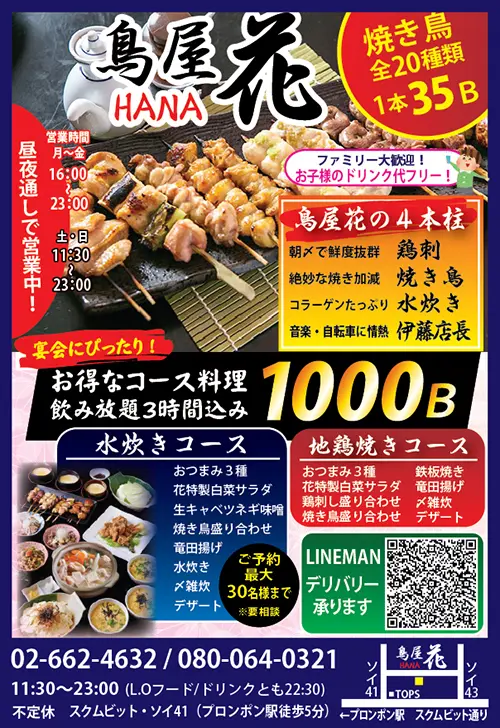 夜は濃厚な鶏のスープが絶品の水炊きや焼き鳥盛り、宴会セットは1人1,000バーツでコース料理と3時間飲み放題付きで、かなりお得な価格設定となっています。下の広告参照で。