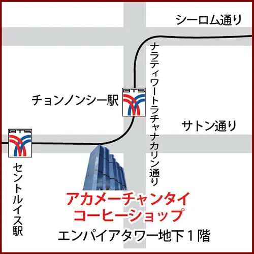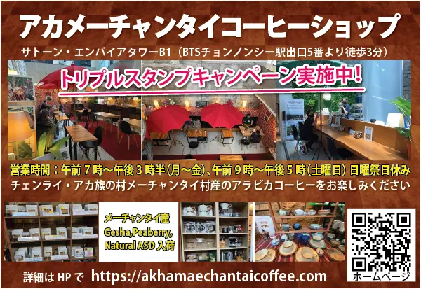 サトン通りのエンパイアタワー地下にオープンしている「アカ・メーチャンタイ・コーヒーショップ」は、タイ北部チェンライにあるアカ族のメーチャンタイ村のコーヒー豆のみを使用しています。