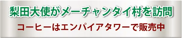 「アカ・メーチャンタイ・コーヒーショップ」 梨田大使がメーチャンタイ村を訪問 コーヒーはエンパイアタワーで販売中