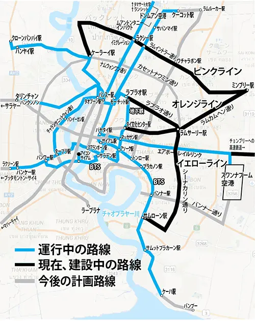 さらにこのあと、重要な路線の建設としては、トンロー通りを通るグレーライン、プラトゥーナムを通るオレンジライン西側、さらにバンナー通りのスワンナプーム空港まで行く路線などが上げられる。