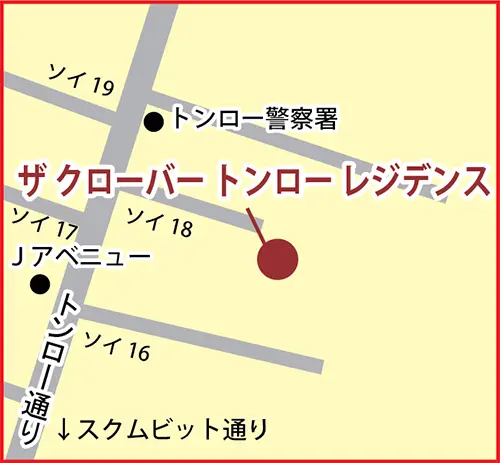 トンロー通りはプロンポンと同じぐらい、物件をお求めになる方も多く、対象理由もさまざまです。日本人学校のバスが来るのは当たり前ですが、日系の幼稚園やインタースクールも点在しています。意外ですが塾も多くそれが理由で、この界隈で探される方も多いのも事実です。病院もこの物件からは2か所日本語対応病院へ向かえ、立地も悪くありません。一番は飲食店がとにかく多く、日本食店は当たり前ですが、ウィットにとんだインターナショナル店も出店しています。必ずひいき店が見つかることでしょう。界隈でも有名なトンロー警察も近くにあって、一般庶民にはより安心なエリアじゃないでしょうか。 交通の便としても、各方面へ向かえ帰りも意外にすんなり来られるのは、バンコクの渋滞を考えると、ストレスがないのはありがたいでしょう。シャトルサービスはありませんが、このトンロー通りだけを巡回している赤バスが、駅まで送ってくれますよ。弊社の看板もあるのでしっかり見てくださいね。