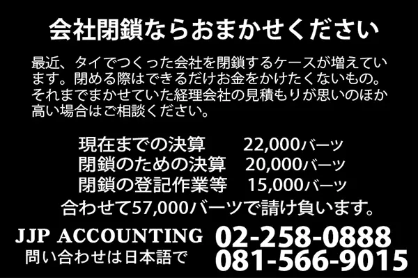 あるいは、休眠状態にする場合は、決算費などを含め1年間で2~3万バーツの費用がかかります。詳細については下の広告内の電話まで日本語でお気軽にお問い合わせください。