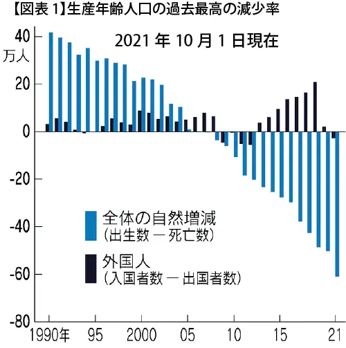 2021年10月1日時点の生産年齢人口(15~64歳)の割合は過去最低の59.4%となった(日経新聞2022/4/16)。また、新型コロナウィルス(以下、「コロナ」という。)による外国人労働者の減少も重なり過去最高の減少率となっている(図表1)。