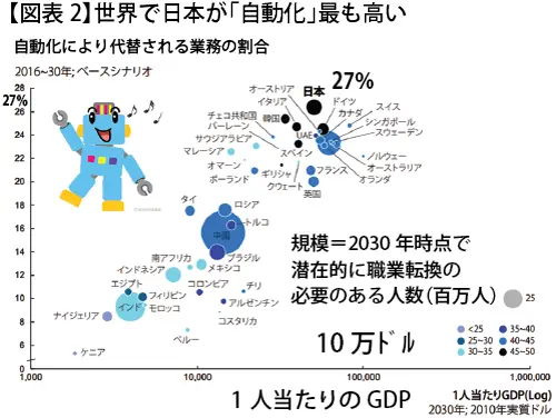 みずほ総合研究所調査(2017年)によると、日本の労働人口は、2030年には、2020年比524万人(約1割)減少すると予測している。 一方、マッキンゼー調査(2020年5月)によると、世界で日本が最も「自動化」により代替される業務の割合が高く(図表2)、労働人口が減少しても、早期に「自動化」に着手し労働生産性を2.5倍にすれば、2030年においても現在のGDP成長率を維持できるのではないかと推定している。