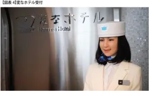 お掃除ロボット、配膳ロボットなどが登場し、AIが身近になった現在、スーパーやコンビニでは、人手不足解消や生産性向上などのために無人レジを導入し、無人コンビニ(QR1)の実験も各地で行われている。スーパーではセルフレジを利用する機会も多いでしょう。 銀行では、フィンテックやキャッシュレス化が急速に進んでおり、複雑な数値計算もAIが全て行うことになるであろう。ホテルも自動化が進んでおり、長崎県のハウステンボスには世界初のロボットホテル「変なホテル」が登場(図表4)。