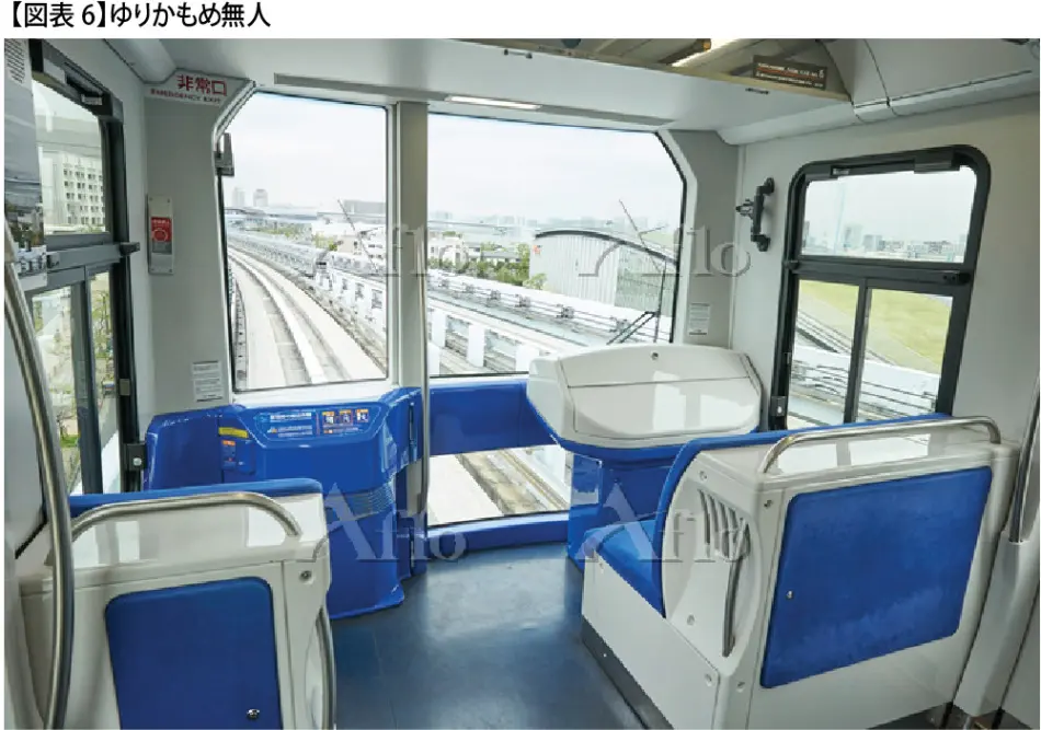 AIロボットがフロントに立ち、おもてなしをしてくれる。ビルの警備は市場が大きく、既に、アルソックやセコムなどから警備ロボット(QR3)が発売されている。ゆりかもめ(図表6)や大阪のニュートラムなどが無人運転化されていることを考えると電車も無人運転化されるであろう。タクシーの無人運転化は中国・上海ではすでに実施されている(QR4)。