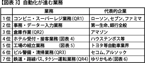 自動化が進展する業務の共通点は、1つは、無人レジや自動車工場の組立ロボットのようにテクノロジーによる代替がすでに始まっている業務である。2つめは、路線バス運転や工場の組立てなど誰がやっても結果が変わらない業務だ。3つめには、人件費などが多くかかるなど利益率が低い業務である。これらの業務は、今後さらに自動化が進むことになるであろう。