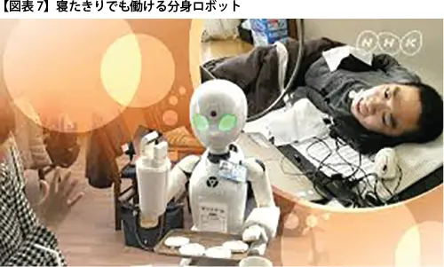 障害などで、外出の困難な人たちがパイロットとしてロボットを動かし、接客してくれるという「分身ロボットカフェ」(QR6)が2021年東京・日本橋エリアにオープンした。分身ロボットを開発した吉藤氏によると、分身ロボットカフェで本当に実現したかったのは、障害者など外出困難な人たちに対して「働く」という選択肢を提供することだという。これまで「働く」という選択肢を持ち得なかった、身体障害者・外出困難者の方々を、もう一つのカラダ・分身ロボット(アバター)を通して、自宅や病院からパソコン操作ひとつで、外部とコミュニケーションを図ることができるようにした。(図表7)。同氏は「人は生きている限り、いつか外出困難になる。それは病気かもしれないし、社会情勢かもしれない。その時に、自分らしく生きられるロールモデルが無い」と問題点を指摘。分身ロボットカフェは、そのための取り組みでもあり、障害者だけではなく、「全人類に当てはまること」だとした。 今後、自動化の進展により、様々な素晴らしい可能性が開けることを期待していきたい。