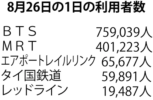 その8月26日の利用者を見ると、全体では1.305,317人が鉄道など、交通機関を利用しており、そのうちBTSの利用者はダントツで、759,039人。続いてMRT地下鉄の利用者は401,223人。そのほか、利用者がそれほど伸びていないのはエアポートレイルリンクで、65,677人。