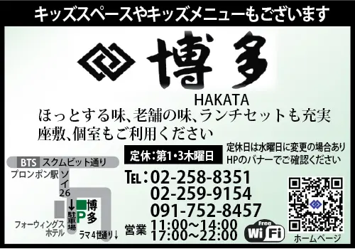 大小の個室があり、子ども連れのファミリーや駐在員にも定評の日本料理店「博多」。2階の個室は最大35名まで利用できるので、宴会や歓送迎会、大人数での集まりの際には、ぜひ、利用して下さい。