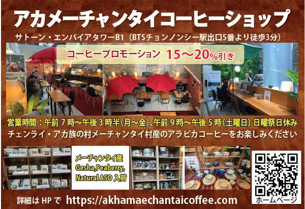 タイ北部チェンライにあるアカ族のメーチャンタイ村のコーヒー豆のみを使用している「アカ・メーチャンタイ・コーヒーショップ」は、サトン通りのエンパイアタワー地下にオープンしています。
