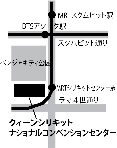 バンコクでのエンターテイメントの1つに、イベント、催しに行くというのがあります。今回はさきごろ、装いを新たにオープンした「クイーンシリキット・ナショナルコンベンションセンター」に行ってみました。今回はBTSアソーク駅でおりて、ベンジャキティ公園を見たかったので、そこを通り、向こうに見えてくるのがシリキットです。