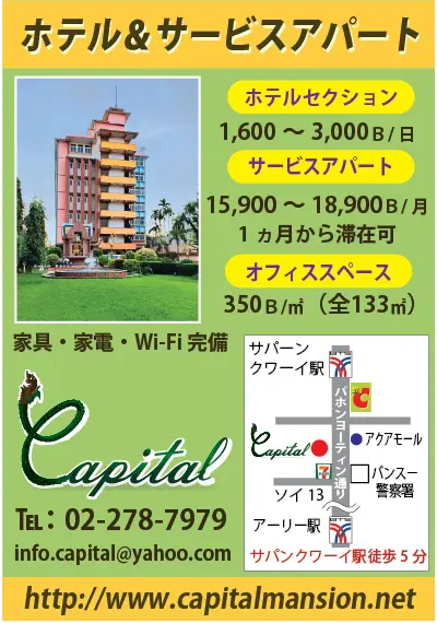 パホンヨーティン通り沿いでBTSサパーンクワーイ駅とアーリー駅の間にある「キャピタルマンション」では、サービスアパートの賃料を値下げしました。以前は1ヵ月の賃料が18,000バーツ~25,000バーツでしたが、現在は15,900バーツ~18,900バーツになっています。賃料には月2回の掃除が含まれています。