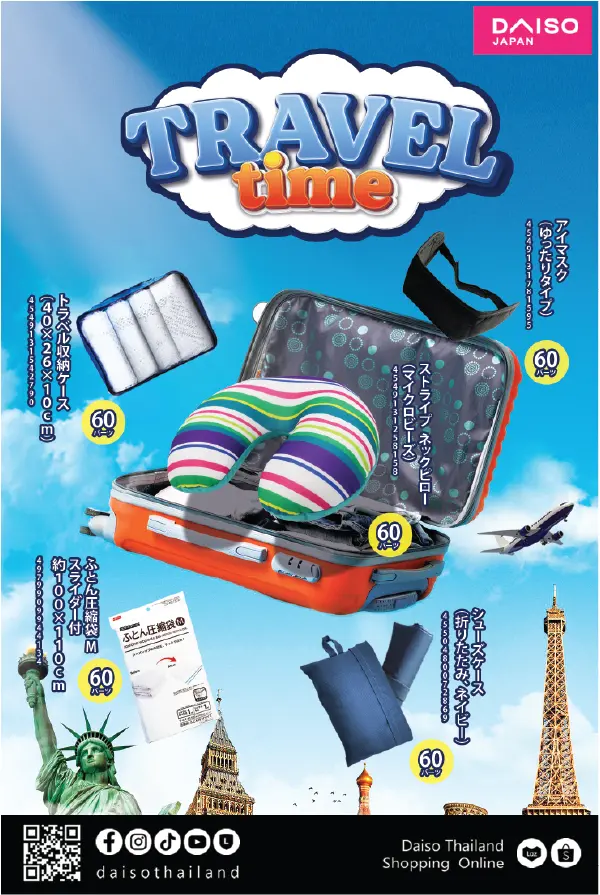 ほかには、年末年始の旅行にピッタリなトラベルグッズも用意。たとえば、移動中に座ったまま眠るのに便利なネックピローやゆったりタイプのアイマスク、小さく折りたためるシューズケース、スライダー付きのふとん圧縮袋はそれぞれ60バーツで販売。日用品やキッチン用品は日本でも人気の商品が多く入荷。タイでなかなか見つからない日本のお菓子や調味料、文房具などもあります。