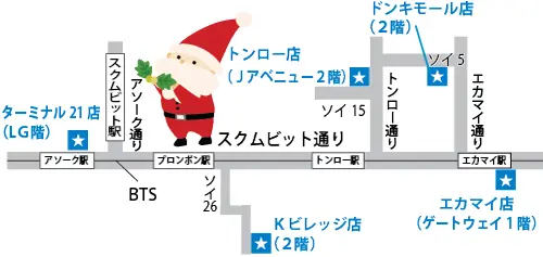 日本人が行きやすくて便利な店舗はスクムビットなら、BTSアソーク駅直結のターミナル21店(LG階)、BTSエカマイ駅直結のゲートウェイ・エカマイ店(1階)、トンロー・ソイ10のドンキモール店(2階)、トンロー・ソイ17のJアベニュー店(2階)、スクムビット・ソイ26のKビレッジ(2階)など。
