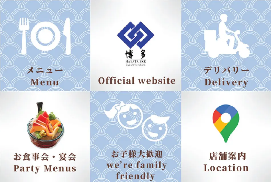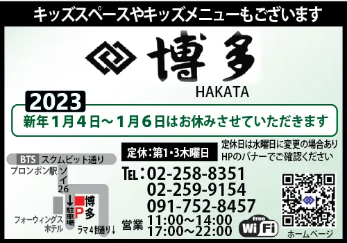 スクムビット・ソイ26にある老舗日本料理店「博多」。LINEに友達登録すると、下部にリッチメニューがあります。メニューからはランチメニューをはじめ、すべてのメニューが見られます。お子様大歓迎をタップすると、好評のキッズスペースや2階の個室の様子、お子様メニューなどが簡単に見られます。その際、出来れば前もって予約すると(ディナータイムの場合は当日14時まで)、お子様の年齢に合わせたおもちゃを用意してもらえます。