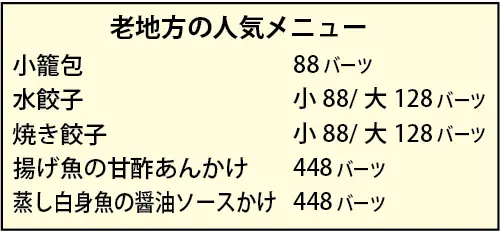 また、日本人の好きな「小籠包」は88バーツ。「水餃子」や「焼き餃子」は小88バーツ、大128バーツ。