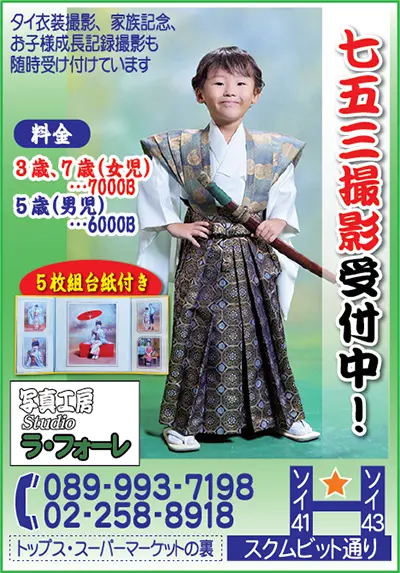 一方、タイ民族衣装撮影や七五三以外のお子様の成長記録撮影も随時受け付けております。場所はスクムビット・ソイ41のトップススーパー裏手です。