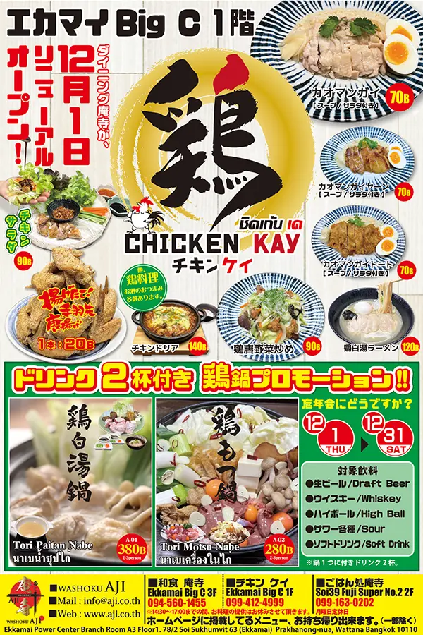 エカマイのパワーモール1階にあるダイニング庵寺は2022年12月1日より「チキン ケイ」としてリニューアルオープンしています。